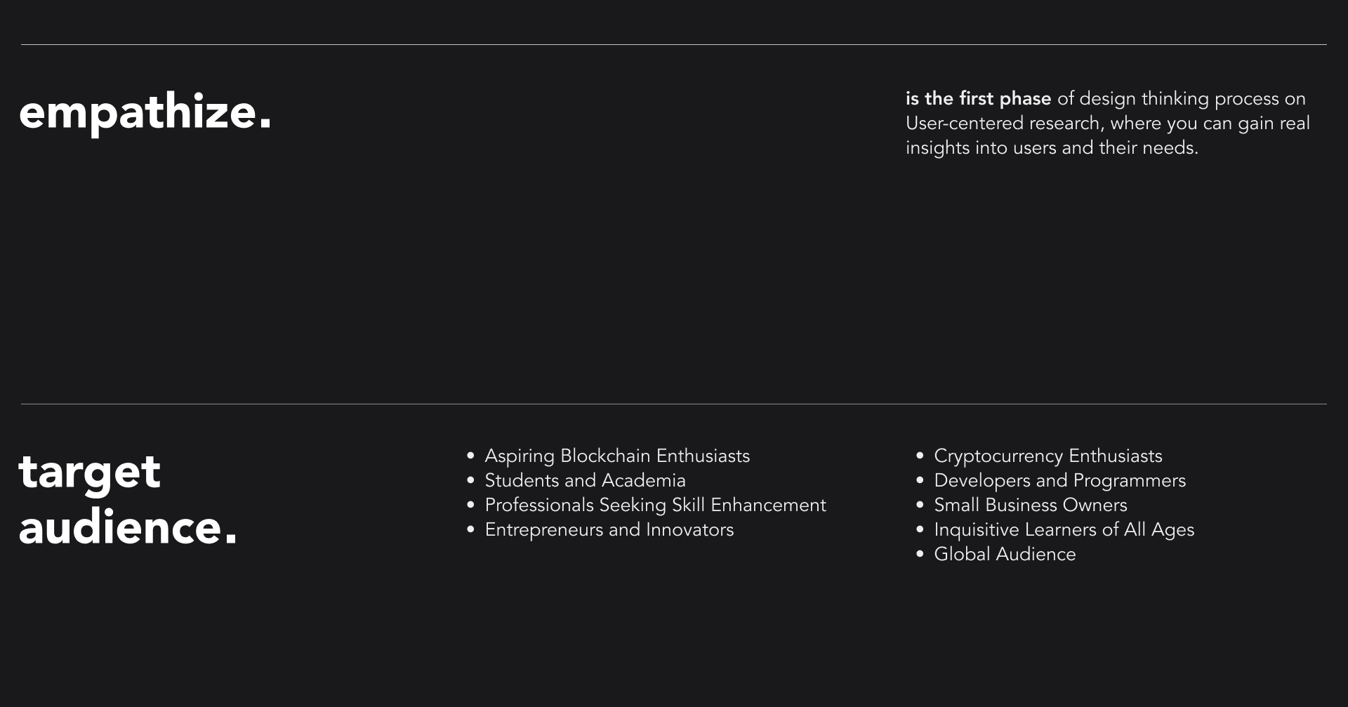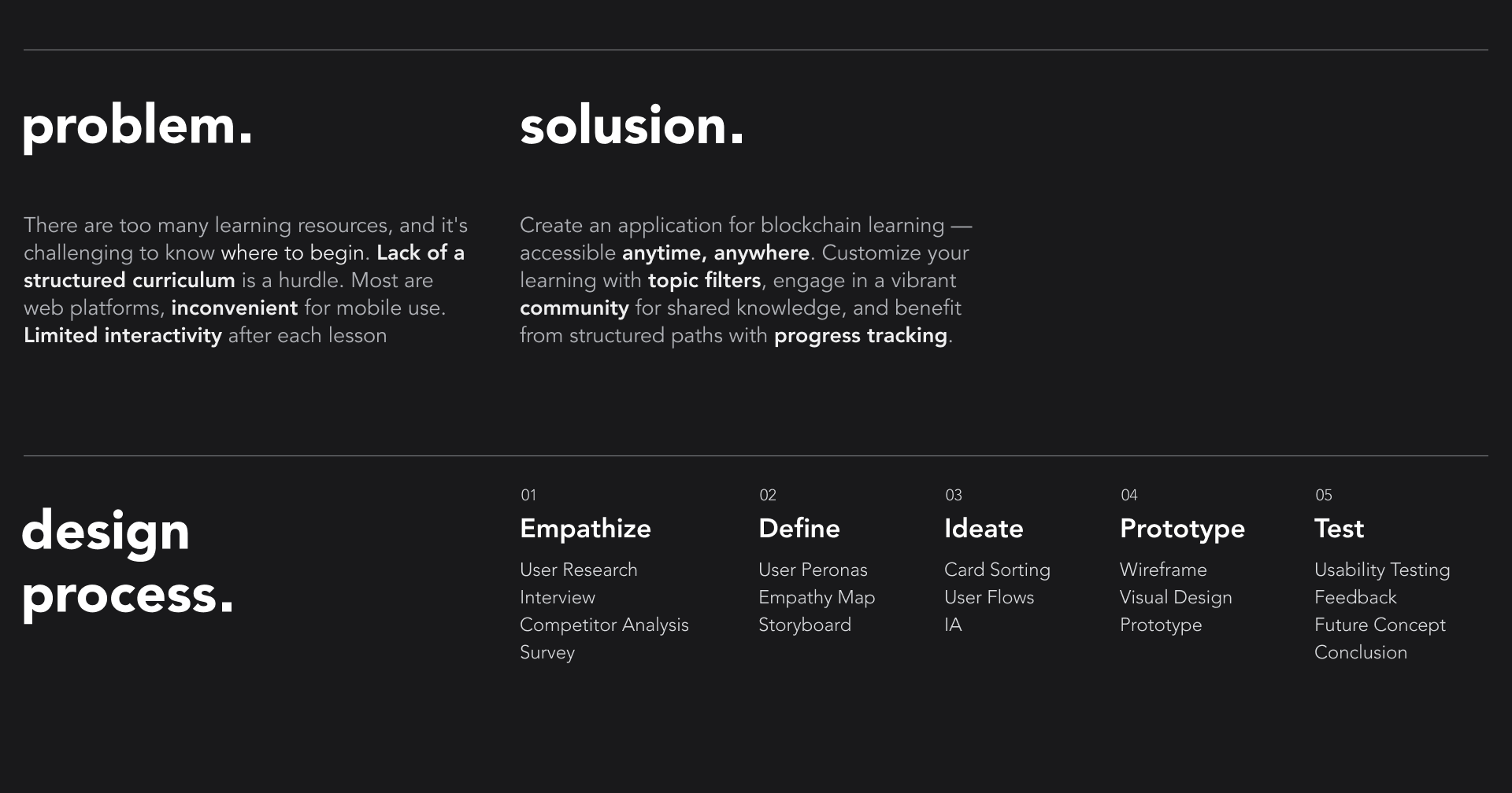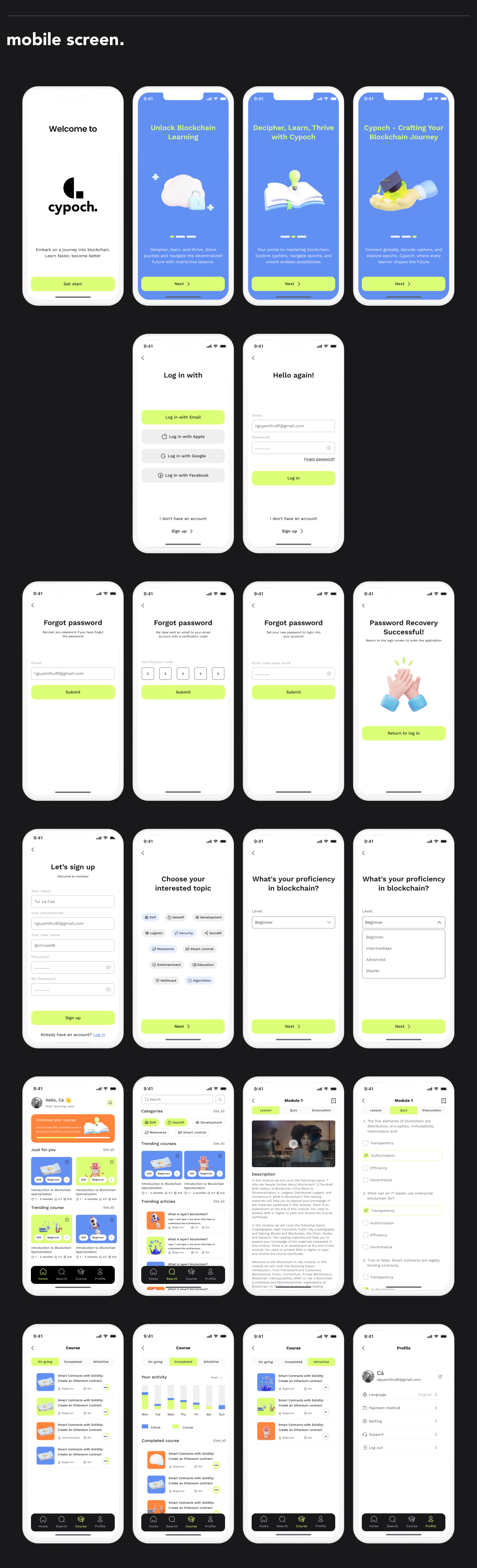 An e-learning app blending education with blockchain's potential, helping users master blockchain concepts. My role involved using the design thinking process—empathize, define, ideate, prototype, and test—to create a visually appealing, user-focused educational app.